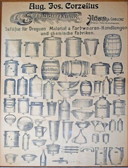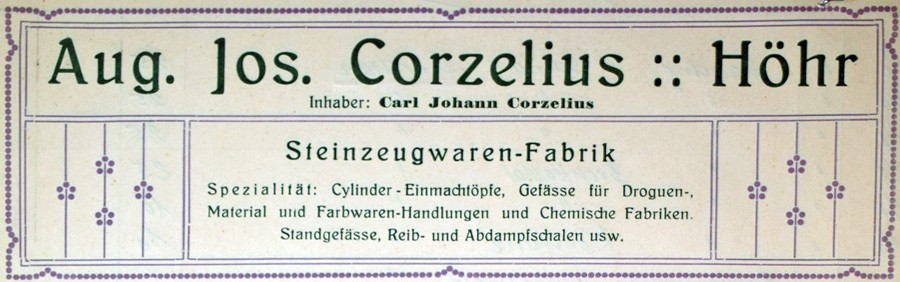 in 1874, August Josef Corzelius married Thekla, the daughter of the potter, Johann Josef Gerhards, and subsequently in 1878, took over and renamed his father-in-law's factory at Bergstraße 4.