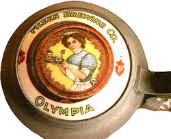 "Pilsen Brewing Co. Olympia".Pewter lid with ceramic insert on glass stein.