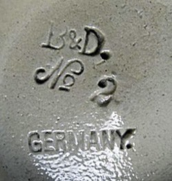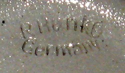Basemark on an identical straight side stein, showing the sanserif "Germany." which confirms this was made by Reinhold Hanke. Steins marked #2, are about 5" tall,