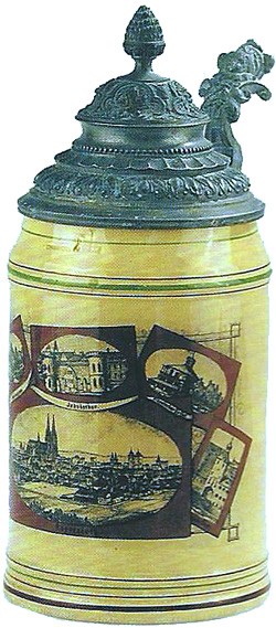 1 / 2L beer stein, no. 211. Decorated with six views of Regensberg, which includes the river Danube with views of the Cathedral, St. James's Gate and the Bridge Gate prior to rebuilding. Impressed mark "H. Waffler". Dated by architectural changes to the relevant buildings, between 1869 and 1902. Note the capacity mark on the front top lip, as is common on other Regensberg steins.