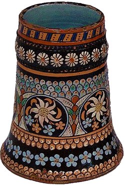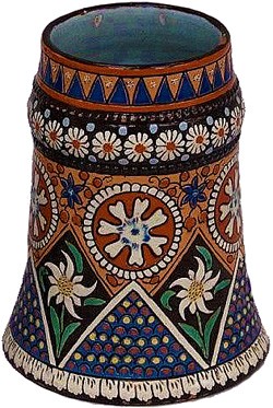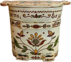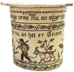This vessel is a miniature pottery representation of a Milch Bränte (Tause), which was a backpack, originally made of wood, but later of steel, with a capacity of 10 - 15 litres for the transportation of milk in mountainous areas of Switzerland. Swiss German, " Es git gar mänge arme Ma, wo wäger nit e Chueh verma; he nu, so het er Geisse! " High German, "Es gibt gar manchen armen Mann, der nicht einmal eine Kuh vermag, he nun, so hat er Ziegen!" English, "There are many poor men who cannot afford a cow, so they have goats!"