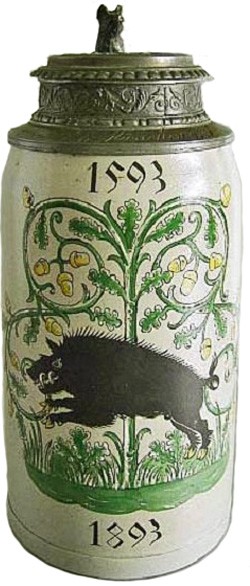 The company specialized in elaborately designed character steins, sourced largely from the stoneware manufacturer Hauber & Reuther of Freising. These were painted and fitted with pewter lids by Bauernfreund. The Bauernfreund company did not have its own outlets but sold its wares primarily through salesmen working on commission. Three Jewish, Munich-based merchants-