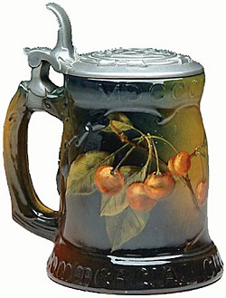 Initially, all the pottery executed by Maria Longworth Nichols and her friends were individual unique studio pieces. William Watts Taylor introduced a more structured production process by involving a large number of artists whose works were characterized by slip-painting, resulting in low relief, together with glazes in a variety of colours. The artists themselves slip-painted moulded bodies using atomized sprayers with different colours of slip. While it was common to work from a stock illustration, each piece is unavoidably unique. The most popular glaze, referred to as their "standard glaze", was a dark greenish brown which was applied in a gradient, often shading from a light gold or yellow to dark brown, as shown below. This glaze was very suitable for depictions of fruit, berries, plants and other organic themes. At a later stage they turned to less artistic works, often monotone coloration, more mass production oriented. Lidded steins were only made around the 1890's. Whilst mugs which were never intended to be lidded are reasonably common among their works, Rookwood operated a small "in house" pewter works between 1894 and 1897, and a small number of steins were actually lidded there.