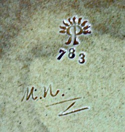 N.B. The reverse "R" adjoined to "P", surrounded by flames, denoting Rookwood Pottery, and in this case on the featured stein, mould #783. Beneath is the signature of Mary Madeline Nourse. To date the piece, count the number of flames crowning the RP logo. From 1886 to 1900, a new flame was added until there were a maximum of 14 flames around the RP in 1900; (ensure that you do not include the diagonal of the R). In this example above, there are nine flames, indicating 1895 as the year of manufacture. If there are Roman numerals under the RP logo crowned by 14 flames, then these date the pottery from 1901 until 1967. Therefore the mark below indicates a manufacture date of 1903.