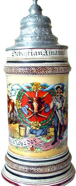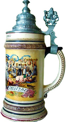 Side view of the featured stein above.Butcher's Occupational stein, decorated on a Black Handled Marzi & Remy