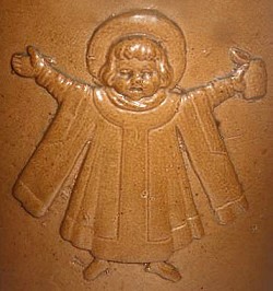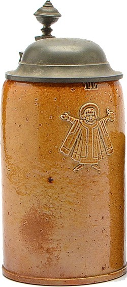 1 litre stein with a moulded Münchner Kindl manufactured by Doulton of Lambeth, London, U.K. and distributed by Thierry & Breul of Munich, dated 1866 - 1885. It was probably lidded in Munich.