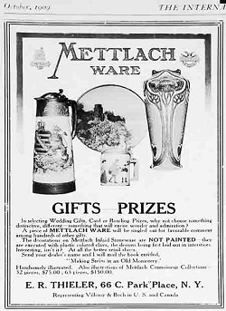 This is the front cover of a 1909 publication by E. R. Thieler, to celebrate Villeroy & Boch - Mettlach's centennial as a pottery. This booklet is mentioned in all of the advertisements published from 62 and 66 Park Place.