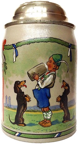 Boy swilling beer with the twin dogs Schnick and Schnack begging for a taste.