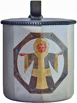Marzi & Remy #6116, this octagonal piece was designed by E. v.Seidl, for the Bayerische Gewerbeausstellung (Bavarian Trade Fair) of 1906. It comes in stoneware, pewter and pressglass versions, with various decorations. This decoration was possibly by Franz Ringer for the Bayerische Gewerbeausstellung 1912. Martin Pauson commissioned a similar design but with a decagonal pressglass stein with triangular facets. The flat Pauson lid is very similar to Seidl's design.