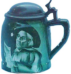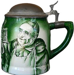 "Man reading Madison County Times newspaper". Stein is by Chittenango Pottery Co. Pewter lid is by Manning Bowman.