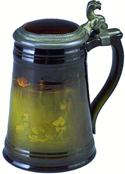 Rookwood Standard Glaze. Lidded stein with inlay. Pond with waterlilies and frogs playing cards. Dated 1895. N.B. The same handle used as stein #775.