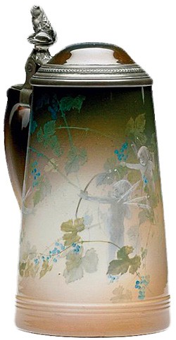 Rookwood #775. Lidded stein with inlay. Cupids with bows, and with a frog as a thumbpull. Dated 1898.