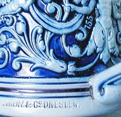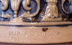 This area is now totally redeveloped). In 1883 he added a porcelain decorating shop. By the 4th March 1888 he had moved to Pirnaischestraße 50. In the same year he discontinued the commissions business, but continuing the porcelain decorating, he founded the "Fabrik Dresdner Bierseidel". On February 17, 1889 the advert states "Lorenz & Co." (vorm. Osw. Lorenz), so just before this Oswald Lorenz had died. The company then became "Lorenz & Co." because his widow Marg. (Margarethe?) née Langer, took on a partner Paul A. Teetzmann as co-proprietor. The company moved to kleine Plauenschestraße 30, at the same time. By 1894, Paul A. Teetzmann was sole proprietor of "Fabrik Dresdner Bierseidel Lorenz & Co.". Marg. had either sold the company and left Dresden or she had died, because she was not further mentioned in the Dresden Address book(s). Paul A. Teetzmann ran the company until 1926/1927. In 1927/1928 the company belonged to his heirs. From 1929 the company was run by B.J. Gliebine and Elisabeth, Teetzmann's widow. Their last entries for the address book, and the register of trade were in 1938 .