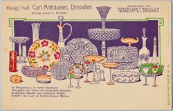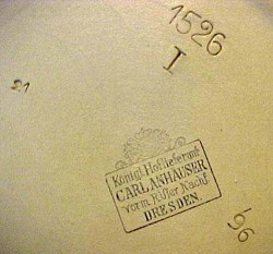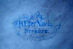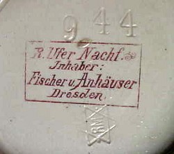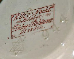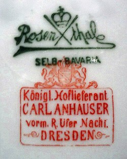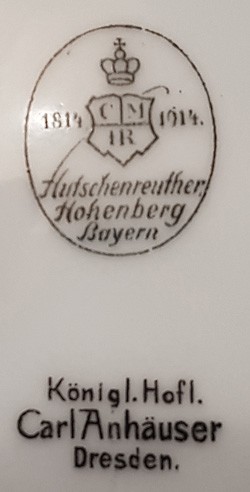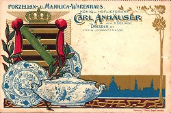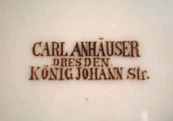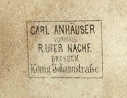 Villeroy & Boch, together with Saxon, Bavarian, Bohemian and French Porcelains. Decorating shop and glazing ovens. Specialities: Washing stands and Majolica plates. The new company name was listed as "Carl Anhäuser vormals R. Ufer Nachf." only from 1896. Fischer disappeared from the address books in 1903. By 1897 both Anhäusers had moved their private address to the ground floor at Comenius-Straße 43. In 1898, M. Josephine, now a widow, moved on her own to Zöllnerstraße 25 until 1909 when she disappeared from the records. Meanwhile the porcelain decorating shop at Drehgasse closed, but in 1899 they took over the second floor of Moritzstraße 15. Carl was appointed a deputy judge dealing with commercial matters in 1907, and became a full judge in 1909. He held this position until 1917. By 1915 the business had deteriorated and so Moritzstraße 15 was closed. Due to the King of Saxony's earlier abdication, Carl stopped claiming the title of Königlicher Hoflieferant in 1921. In the same year he appointed co-proprietors, which included his wife Marie, together with Phil. Heinrich Feickert and the widow, An. Martha Ida Pohl. An additional co-proprietor, Dr.phil. Jos. Adam Schreiber had been appointed by 1926. As was the requirement at the time, Carl’s name was re-spelt Karl, but he never changed it for the company records. After 1930 a decision was made to concentrate on selling more Lead Glass Crystal, rather than earthenware. Carl Anhäuser died in 1932. In 1933 the company name was changed to just "Carl Anhäuser", and Phil. Heinrich Feickert ceased to be a co-proprietor. In 1937, an entrance was officially recorded giving access directly onto the prestigeous city centre street of König-Johann-Straße (*3), although the company had been claiming it as their business address since at least 1897. Carl Anhäuser's wife, Marie, probably died in 1941. So by 1942 the wife of Jos. Adam Schreiber, Marianne, together with Cäcilie May had become co-proprietors. There are no records after this date, but in February 1945 this part of Dresden old town was completely destroyed by bombing. It is unknown whether the company restarted after WWII.