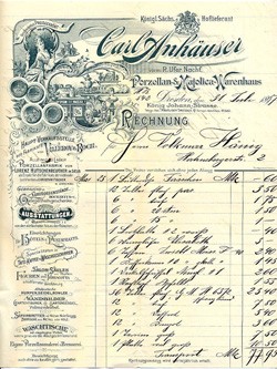 Hermann A. Fischer was first recorded as living in Dresden at an der Bürgerwiese 22 (3rd floor) in 1886. By 1887 the company had moved to the ground floor of Moritzstraße 13 (*1), whilst Fischer lived on the 1st & 2nd floors on Badergasse 31. He had planned to move to the second floor above the shop in Moritzstraße 13, by Easter. Meanwhile, Dresden resident, Carl Joseph Anhäuser had become a co-proprietor. As he had been living together with M. Josephine Anhäuser (not wife - possibly mother) on the 1st floor of Königstraße 20, they both moved into the Moritzstrasse 13, (second floor) address. Therefore Fischer moved to the 3rd floor of Struvestraße 36 instead. By 1888 the company had expanded to occupy both the ground and first floors of Moritzstraße 13. By 1891 they were claiming to be the largest ceramics retailer in Germany, specialising in wedding dinner services and presents. They purchased various porcelain and stoneware products from, amongst others, Villeroy & Boch, Utzschneider & Co. and Zwickauer Porzellanfabrik (Inhaber Christian Fischer. In 1893 they opened a porcelain decorating shop on the first floor of Drehgasse 6 (*2).