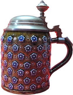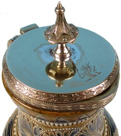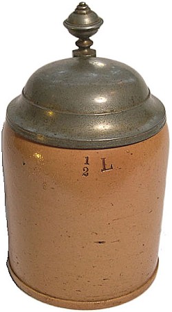 German style stein made between 1869 and 1872, presumably made for export. N.B. the capacity mark is at the front, with no line between the one and two and in litres NOT pints. Stein was probably lidded in Germany.