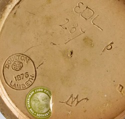 "EDL" for Edith D Lupton, worked for Doulton's, circa 1875 to 1890. This particular item was made in 1876. The paper label would indicate that this tankard was part of the Harriman Judd collection, which was auctioned in New York & London, in January 2001.