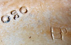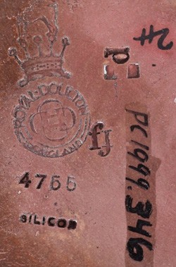 Impressed marks on the base of large Royal Doulton Server #5238, dated 1902 onward, FJ for Florrie Jones.