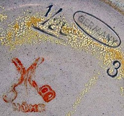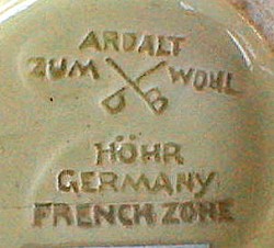 Impressed mark on a small plate showing the mark of the French Zone (The Ruhr & Saarland) of post-war Germany, dated 1945 - 1949.
