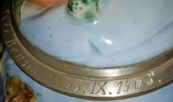 "Pig in a poke" Character stein #5399, (ECS51), having the inkstamp mark of the 1886 - 1952 era. With Hermann Hutschenreuther's death around 1898, the remaining directors reduced emphasis on figural's to concentrate on every-day porcelain, which probably dates this piece from 1886 to circa 1900.