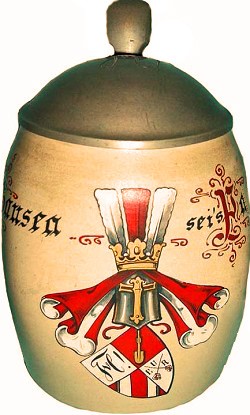 Student stein by Reinhold Merkelbach #1741, dated 1908. The Wappen represents the "Corps Hansea" founded on 11/07/1849. The colours of white-red-white are derived from the Hanseatic flags and its Latin motto "Recte facienti nihil timendum!" translates as "Der Rechtschaffene hat nichts zu furchten!" or "The honest have nothing to fear!" The coat of arms contains the motto "Ehre und Recht" meaning "Honour & Justice". The members of the "Corps Hansea", which still exists today, are called "Bonner Hanseaten" or more commonly "Bonner Hansen" or even just "Hansen". References: Corps Hansea Wikipedia
