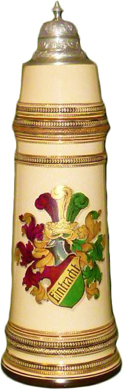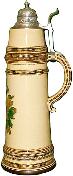 This stein, dated 1896, celebrates the 60th Stiftungsfest (Foundation Celebration) of the Christliche Studentenverbindung (C.St.V) Uttenruthia Erlangen. Founded on 05/03/1836 as a Christian students fraternity, it was the first with a "no fencing" policy. Its members are known as Uhus or Eagle Owls, the colours are Black-Gold-Black, and the motto is: "Frisch, Fromm, Froh, Frei" or " Fresh, Devout, Joyful, Free". It was a founder member of the Wingolfsbund in 1844 and of the Schwarzburgbund in 1887. Finally it was the first fraternity to be reinstated in 1946, after W.W.II, and still exists today. Reference: Uttenruthia C.St.V.Uttenruthia Wikipedia