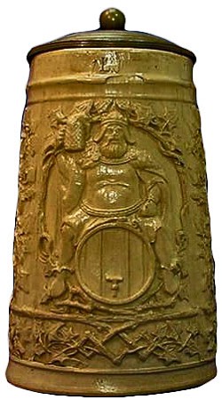 "Gambrinus" relief stein by the Borho, Zinkl or Thenn partnerships of Regensburg, who were in business between 1874 & 1886. This stein is early production from around 1874 to 1877. N.B. The capacity mark is at the front, further denoting a Regensburg stein.