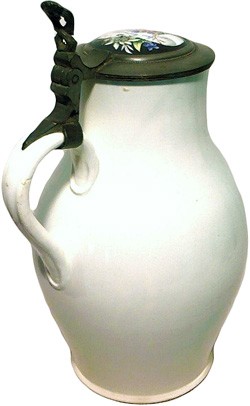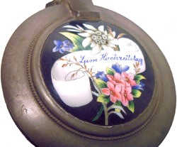 Image shows the insert of the pewter lid on the featured stein (right), "Zum Hochzeitstag" For the Wedding Day