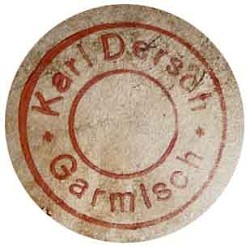 Ink stamp on featured stein, denoting Karl Dersch, Garmisch. N.B. The villages of Garmisch and Partenkirchen had only just been merged earlier ln 1936 to become Garmisch-Partenkirchen.