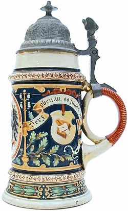 Side view of featured stein. Full text "Ziel genannt, Kraft gespannt, Herz obenan, so fang's an". ("Destination known, power tense, spirits high, so let's begin").