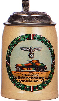 Third Reich stein, 0.5 Litre 1. Kompanie, Aufklärungs Abteilung 4, Sonderhausen / Thüringen.Marked "Schmalz" close to handle. Dated 1933 to 1939. Photographs of this stein courtesy of TSACO.