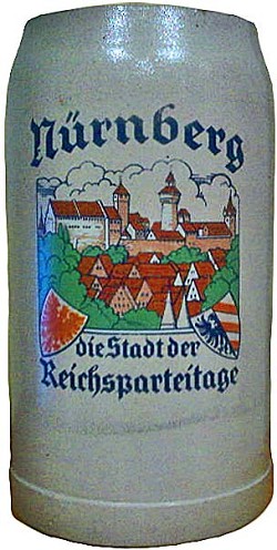 1 litre stein depicting City of the "Nuremberg Rallies", dated 1923 - 1938, with the larger rallies held 1933 onward, on their own specific grounds. The illustration shows the Sinwell tower, centre right; and the Heidenturm, centre left. The right hand shield is the coat of arms of Nuremberg, whilst on the left, is the German Adler.