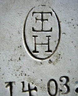 Impressed mark supposedly 1918 - 1971, which can be accompanied by either impressed "Made in Germany" (pre 1949) or "Western Germany" (post 1949) markings, in spite of Höhr combining with Grenzhausen in 1936. This design #1403 was generated by Eckhardt & Engler & not by Roßkopf & Gerz.