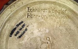 Basemarks on the featured Eckhardt & Engler #424, immediately above. The E&E marks do not have their normal surrounding oval. The "Germany" is also slightly curved. This was taken from character stein mould No. 424 (ex Roßkopf & Gerz #424 Brewer. RuG steins are numbered as high as #939) Supposedly steins with the number 17 are an early (older) Eckhardt & Engler version.