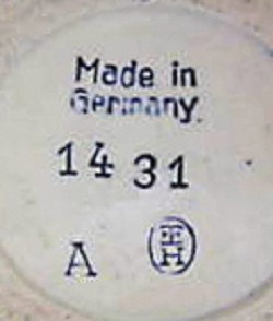 Impressed mark supposedly 1918 - 1971, which can be accompanied by either impressed "Made in Germany" (pre 1949) or "Western Germany" (post 1949) markings, in spite of Höhr combining with Grenzhausen in 1936. This design #1431 was generated by Eckhardt & Engler & not by Roßkopf & Gerz.
