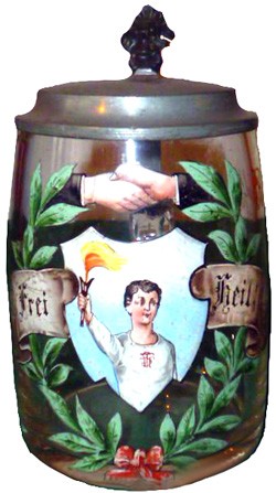 Socialist Turner stein with FFST instead of 4-F logo and Frei Heil (hail freedom) salutation instead of Gut Heil (good health). FFST stands for Frisch, Frei, Stark und Treu (energetic, free, strong and true)