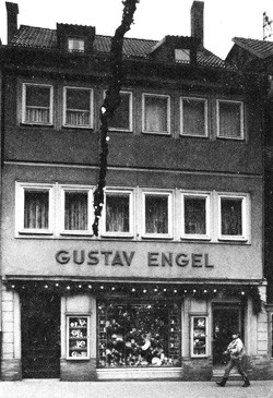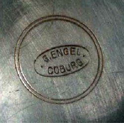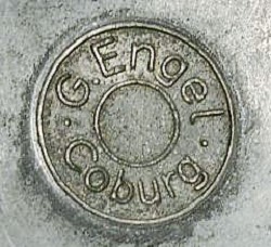 Ludwig Ruckert in Wurzburg, where he stayed as a journeyman, prior to working in Löhr am Main. In 1905 he opened a business in Coburg at Walkmuhlgasse 1, and then In 1906 he moved the business, just around the corner, to Judengasse 17. Since then, there have always been three or four journeymen, plus one instructor, originally Gustav Witter from Neustadt. In 1907 he married Louise Andres, daughter of a brewing master, who came from Königsberg (now a suburb of Strasbourg), Alsace. In 1932 Gustav Engel was honoured for his 25-year-old membership of the German Pewter Foundry Association. In 1955 his excellent workmanship was celebrated during his 50th business anniversary. In 1961 Gustav Engel died. He was the last "Zinngießermeister" of Coburg. His son Fritz, who had become a lawyer, was listed as missing in Russia in 1943. His daughter Hildegard continued the business, but without the foundry. She leased the shop in 1970, which continued as a glass and porcelain store, run by Maria Schönweiss. Today it is a sewing machine business.