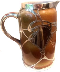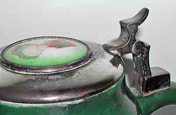 Manning Bowman silver plated pewter lid with an O'Hara Dial insert and the unique Manning Bowman thumb-pull on a 1.5 litre Belleek pitcher. Note another unique method of attaching the pewter work, with a spigot through a drilled hole in the handle.