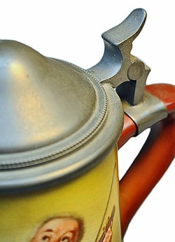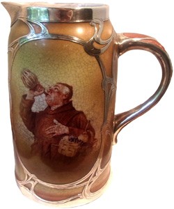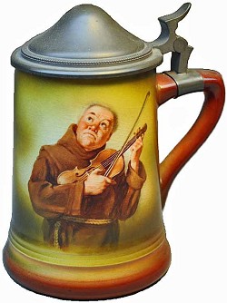 Whiteware stein complete with ubiquitous "Fiddling Monk" transfer decoration and paint embellishment..