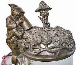 Pewterer's mark on the underside of the lid mounted on the featured glass stein.