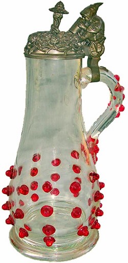 Blown glass stein by an unknown producer, with 4 rows of red "prunts".
