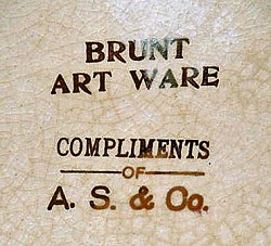 William Brunt Snr. left the oppression and starvation of the English pottery districts for America and freedom late in 1842. He came by the way of New Orleans and thence up the Mississippi River to the central part of southern Illinois. In East Liverpool he opened a public tavern, on the southwest corner of the public square, at Third and Market Streets, which he kept for a considerable period of time. Having been a potter, seeing the business developing around him,eventually returned to this form of industry. In 1847 with his two sons, William Junior and Henry, along with his brother-in-law Bloor, Mr. Brunt built a small pottery at the northeast corner of First Street and Peach Alley. Here these men began the manufacture of brown, jet and "Scroddled" door knobs. The term scroddled means, in the old Staffordshire dialect, marbling or streaking in the body of the ware. The factory is thought to have closed prior to the turn of the century.
