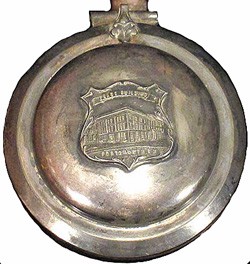 Silver plated lid hinged from a lip mounted band on the stein on the right. The shield depicts the Peace Building, which is the name given the General Stores Building at the Portsmouth Naval Shipyard in Kittery, Maine, which was the site of negotiations that led to the Treaty of Portsmouth, which formally ended the Russo-Japanese War of 1904 - 05. Theodore Roosevelt's role in the negotiations resulted in a Nobel Prize for the president.