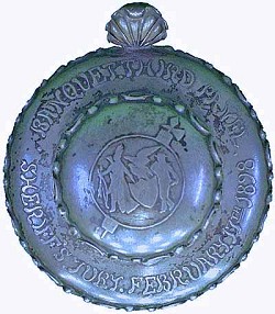 Theodor B. Starr's lid of the featured stein, celebrating "Banquet. Third Panel. Sheriff's Jury. February 17th 1898", held at the Savoy Hotel, New York.