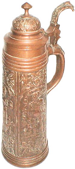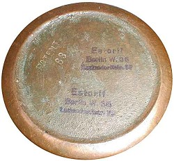 Impressed "Patent" together with impressed mould number "63" added at the "green" pottery stage. The ink stamp of the vendor has been added to the base of the featured stein, after the purchase of the finished product. This item is marked Ludendorffstraße 77, which name only came into existence on the 7th March 1936. It is not known whether the stein was new, when the inkstamp was applied.