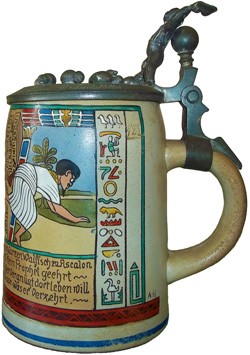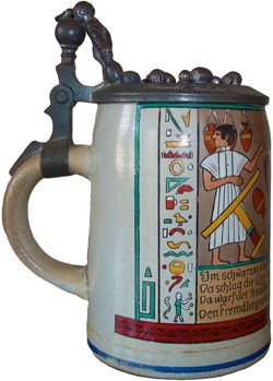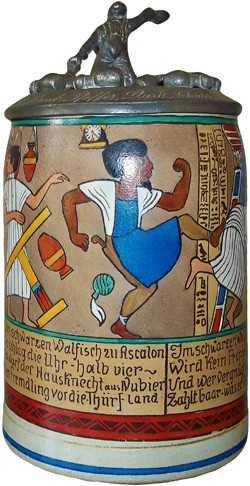 This Stein, together with the one below, each quote a verse/s of the drinking song by Joseph Victor von Scheffel, "Im schwarzen Walfisch zu Askalon" There are six verses below left, so therefore one must assume that these must be two of a range of steins.