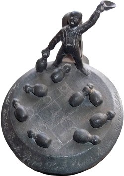 Pewter lid of the stein above, showing player rejoicing having knocked down all 9 pins / skittles.