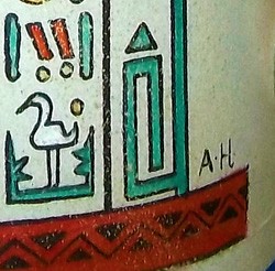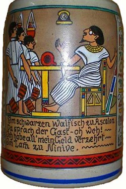 Base marks on the Brüder Thannhauser. München stein on the top row, Im Schwarzen Walfisch zu Askalon Da trank ein Mann drei Tag, Bis dass er steif wie ein Besenstiel Am Marmortische lag. At the Black Whale in Ascalon A man drank for three days Until, stiff as a broomstick, He lay on the marble table. "Im Schwarzen Walfisch zu Askalon Da sprach der Wirt: "Halt an! Der trinkt von meinem Dattelsaft Mehr als er zahlen kann." In the Black Whale at Ascalon The innkeeeper said: "That's enough, He's drinking more of my date juice Than he can ever pay for." Im Schwarzen Walfisch zu Askalon Da bracht' der Kellner Schar In Keilschrift auf sechs Ziegelstein Dem Gast die Rechnung dar. In the Black Whale at Ascalon A group of waiters brought On six tiles written in cuneiform. The bill up to the guest. Im Schwarzen Walfisch zu Askalon Da sprach der Gast: "O weh! Mein baares Geld gieng alles drauf Im Lamm zu Niniveh!" In the Black Whale at Ascalon The guest said: "Oh, my! All my ready cash was spent At the Lamb in Niniveh!" Im Schwarzen Walfisch zu Askalon Da schlug die Uhr halb vier Da warf der Hausknecht aus Nubierland Den Fremden vor die Tür. In the Black Whale at Ascalon The clock struck half past three When the Nubian porter threw The stranger out the door Im Schwarzen Walfisch zu Askalon Wird kein Prophet geehrt Und wer vergnügt dort leben will Zahlt baar, was er verzehrt. In the Black Whale at Ascalon No prophet is honored And he who wants to live there in pleasure Must pay cash for what he consumes.