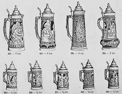 Leopold Gerz produced a range of steins. Above is a small selection of what can be seen in his catalogue, issued circa 1900. The full catalogue can be seen in the Reading Room section at Stein Collectors International
