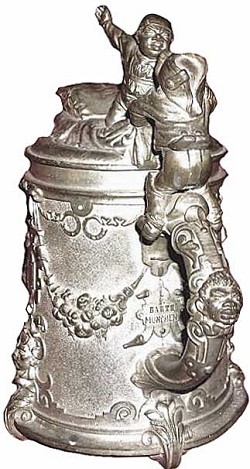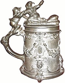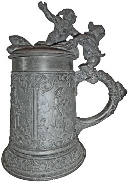 Another view of the featured pewter stein. The maker's signature and date "F. Barth, München. 1871" can be seen behind the handle.